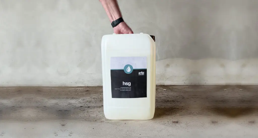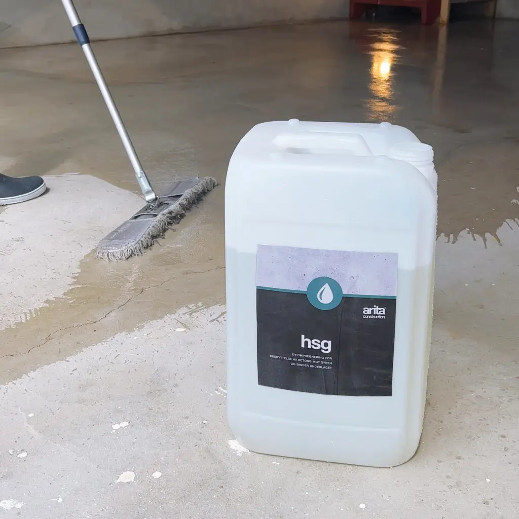 Arita Construction hsg er en dypimpregnering som beskytter betongen mot syrer og vanninntrengning, og støvbinder underlaget. Produktet trekker ca 4 mm ned i betongen og og blir en del av det øverste sjiktet. Resultatet blir et slitesterkt garasjegulv som ikke støver.