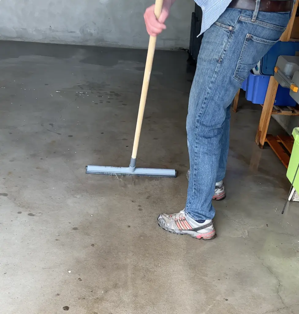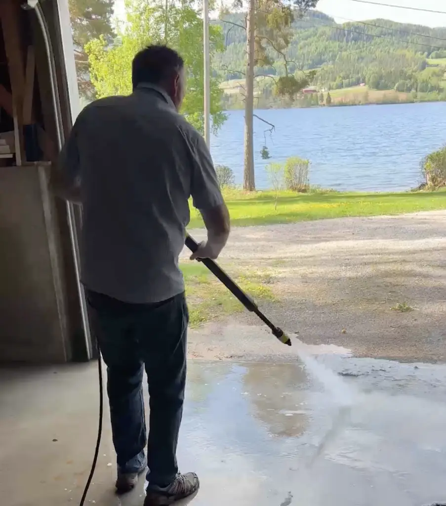 2) Spyl over gulvet med hageslange eller høytrykkspyler